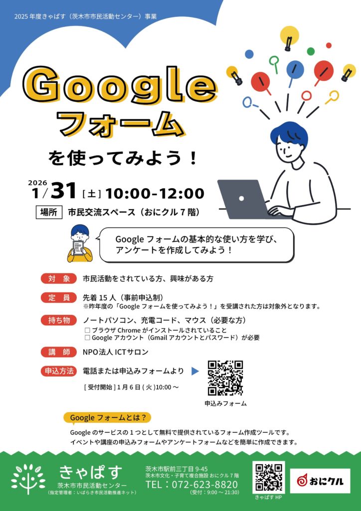 | 対象 | ・市民活動をされている方 ・興味がある方 ※昨年度の「Googleフォーム講座」を受講された方は、対象外となります。 ※先着15名 |