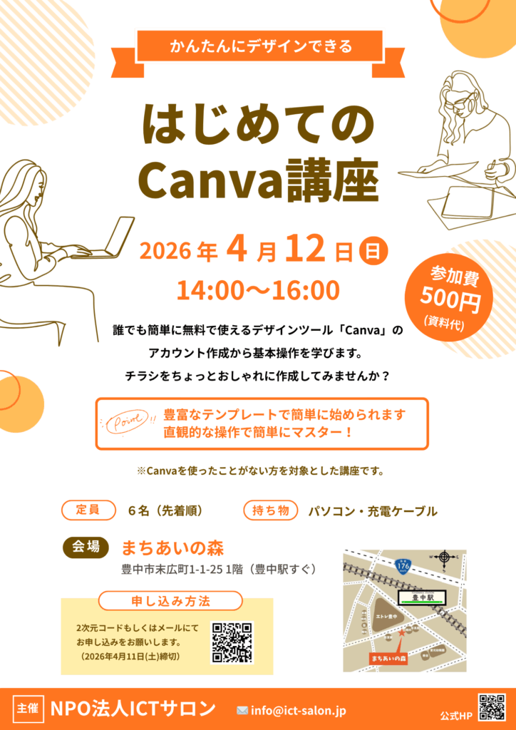2026.04.12 豊中市 はじめてのCanva講座 開催情報 イベント名はじめてのCanva講座開催日時2026年4月12日(日) 14:00~16:00場所まちあいの森豊中市末広町1-1-25 1階(豊中駅すぐ)対象Canvaを使ったことがない方持ち物パソコン、充電コード費用500円(配布資料代)お申し込みこちら ※4/11(土)締切主催特定非営利活動法人ICTサロン協力まちあいの森問い合わせ問い合わせフォームから